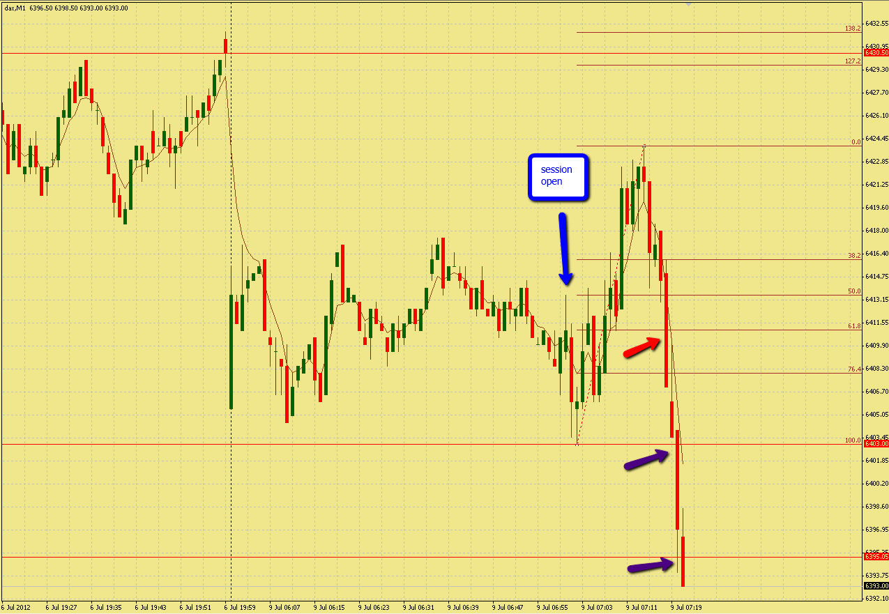 המדד עלה במשך כל שעות הלילה וביתר שאת ב- 10 הדקות הראשונות של ה- session, ולאחר מכן החל לתקן. 2 דקות לאחר פרסום החדשות הכלכליות בשעה 17:00 לפי שעוננו (שלא גרמו לתזזיתיות) קו ה- 61.8% נשבר ונכנסתי לשורט (החץ האדום) ובתוך כ- 10 דקות, כאשר הנמוך היומי נשבר, מימשתי את הרווח (החץ הסגול).